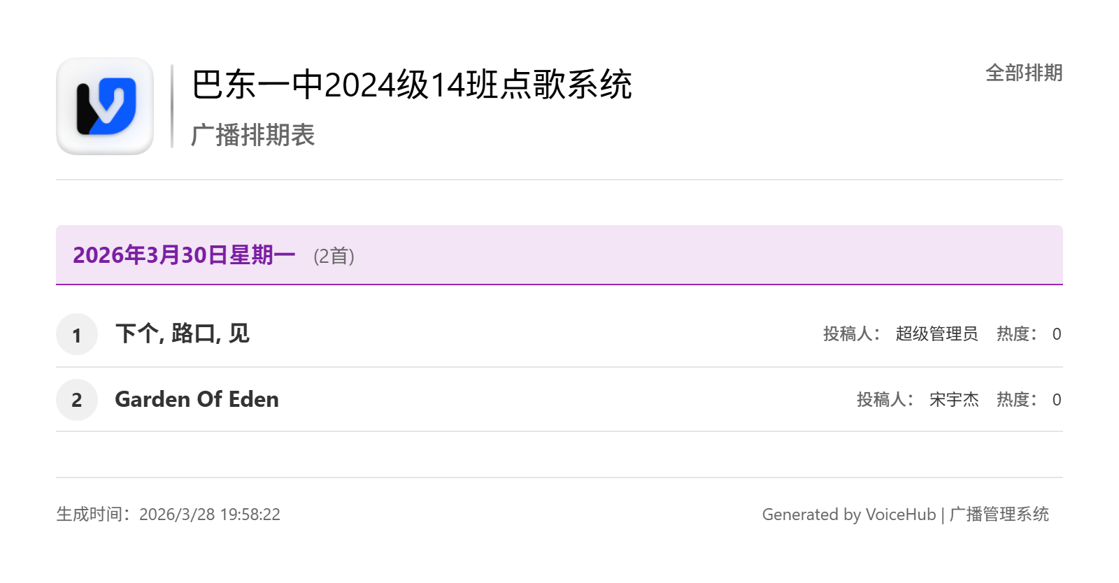 公开展示:公开展示歌曲播放排期,按日期分组展示